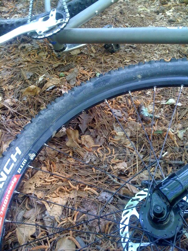 What I didn't plan for was the extra gravity that kept pulling to the ground. About 5 miles in I lost the front wheel on a mild downhill and managed to do what I call an around the bars... sort of like an over the bars without all of the glory. My foot decided the front wheel was a little heavy so it took the opportunity to remove two spokes. I enjoyed listening to the remaining spokes complain the rest of the ride. I was just waiting for them to organize a revolt, taco the wheel and take out their frustrations on my front teeth via a rock / root.